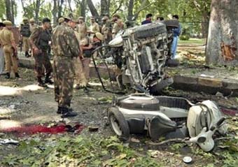 Paramilitary soldiers examine the damaged vehicles after an explosion in Srinagar, India, Wednesday, July 20, 2005. [AP] Indian authorities said a suicide bomber rammed the car into the jeep. But a Pakistan-based militant group that claimed responsibility for the blast said a bomb was hidden in a parked car and triggered by remote-control. India's government called the attack an effort to derail peace talks between India and Pakistan, but promised to push ahead with the dialogue with its neighbor and rival of six decades. No children were hurt inside the Burn Hall School in Srinagar, the summer capital of India's Jammu-Kashmir state, senior police officer Hasseb Ahmed said. However, the blast knocked down some of the school perimeter and shattered windows in a neighborhood filled with homes of top government officials, Ahmed said. The crushed remains of the attack car lay on the leafy avenue near shreds of flesh and the bodies of soldiers. The severely damaged army jeep lay toppled on a side. Bits of the engine, metal and glass shards and other debris lay on the blood-splattered road. "The earth shook and all the window panes were shattered. I was inside and I rushed out. There was smoke everywhere. I saw the bodies," an unidentified witness told a local television news program. A caller identifying himself as Salim Hashmi, spokesman of the Pakistan-based Hezb-ul Mujahedeen — Kashmir's largest militant group — claimed responsibility for the blast in a call to a local news agency, Current News Service. He denied a suicide attacker detonated the bomb and claimed it was set in the parked car. Police did not find the body of an attacker, but said they believed it would have been blown to pieces. Pakistan-based Islamic militants have been fighting Indian security forces in the state since 1989 to carve out a separate homeland or merge the Himalayan region into Pakistan. More than 66,000 people have been killed in the conflict. India accuses Pakistan of aiding and arming the militants at training camps on the Pakistani side of Kashmir — a charge Islamabad denies. Both India and Pakistan claim the divided Himalayan region in its entirety and have fought two wars over it.