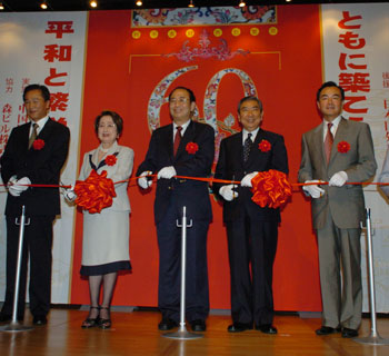 office, and Chinese Ambassador to Japan Wang Yi (R) cut the ribbon at an