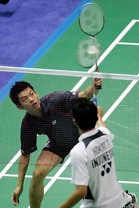 China's Lin Dan (L) and Indonesia's Taufik Hidayat play near the net during the men's singles final at the IBF World Badminton Championships in Anaheim, California, August 21, 2005. Hidayat defeated Lin 15-3 15-7 to win. [Reuters]