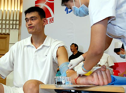 NBA Houston Rockets Chinese centre Yao Ming looks on, as his blood sample is being taken, during a blood donation drive in Beijing, September 4, 2005. Yao attended the event to promote the awareness of hematopoietic stem cell, or bone marrow, transplantation among college students. [newsphoto]