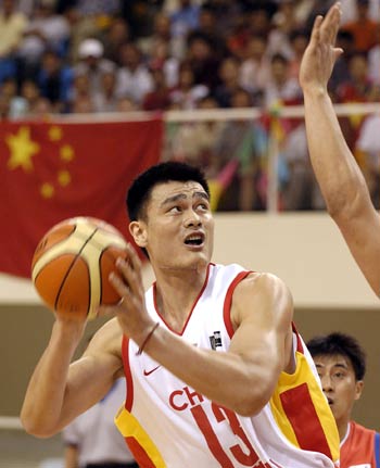China's Yao Ming (L) attempts a shoot during their semi-final match at the 23th Asian Basketball Championship at Al-Gharrafa hall in Doha, Qatar, September 15, 2005. China defeated South Korea 93-49 to qualify for the final round. [Xinhua]