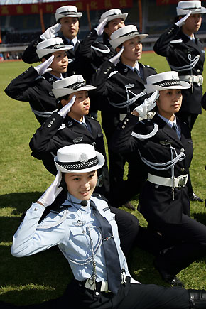 Policewomen move in a square matrix during a parade in Changchun, capital of northeast China's Jilin province, September 22, 2005. Some ten thousand policemen took part in the parade which is the largest in scale of its kind in the capital since 1949. [newsphoto]