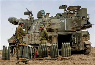 Israeli army gunners stand next to a mobile artillery piece and shells at a staging area near Kibbutz Nahal Oz, just outside the northern Gaza Strip, Sunday Sept. 28, 2005. Widening its five-day campaign against Palestinian militants, Israel for the first time fired artillery shells into the Gaza Strip on Wednesday and shut down 15 West Bank offices suspected of distributing money to families of suicide bombers from the Hamas and Islamic Jihad groups. [AP]