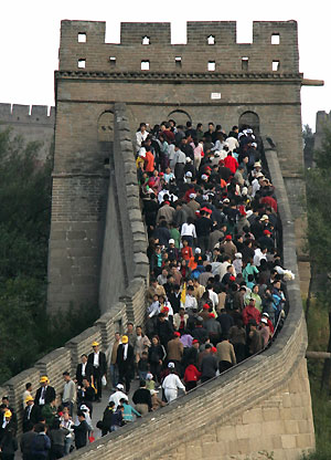 Visitors flock to the Badaling section of the Great Wall of China, north of Beijing, October 2, 2005. The Great Wall is attracting large numbers of visitors during China's week-long National Day "Golden Week" holiday, which began on October 1. [Reuters]