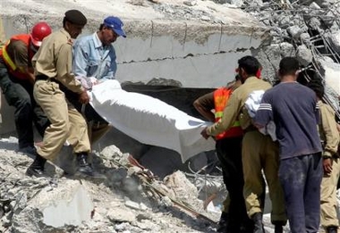 Pakistani rescue workers remove a dead body