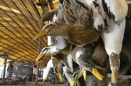 Ducks are displayed for sale at a wholesale poultry market in Nanjing, east