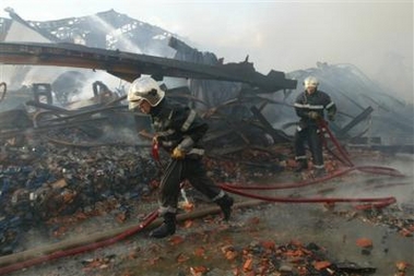 Firefighters at work in the ruins of a Chinese