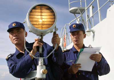 Two Chinese Navy sailors communicate with light signals with Pakistan ships during the drill in the northern Arabian Sea November 24, 2005. [newsphoto]