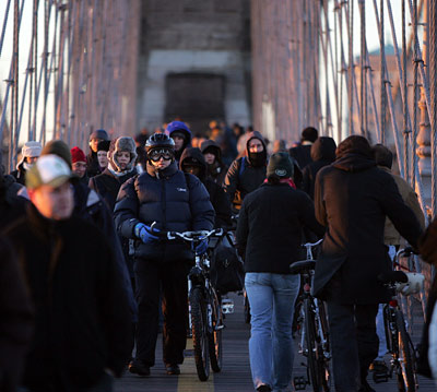 Commuters pack the Brooklyn Bridge during the evening rush hour in New York December 20, 2005. [Reuters]
