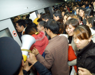 Passengers wait to board a train after the traffic returns to normal in Shanghai, December 25, 2005. [newsphoto]