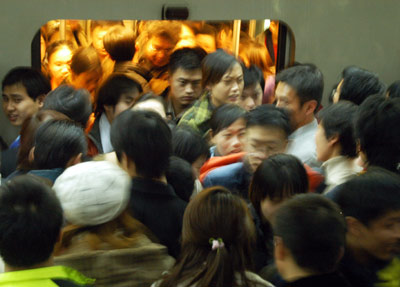 Passengers wait to board a train after the traffic returns to normal in Shanghai, December 25, 2005. [newsphoto]