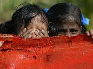 Girls orphaned by the tsunami cry behind a