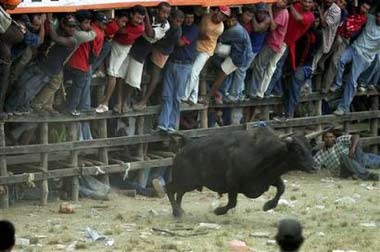 2005. Locals risk their lives jumping into a ring to play with bulls