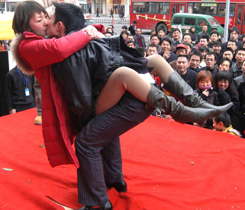Two lovers kiss in a kissing contest on the Valentine's Day in Lanzhou, Northwest China's Gansu Province February 14, 2006. [newsphoto]