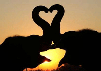 Nam Choke, an 8-year-old bull elephant (L), and Boonrawd, a 7-year-old cow elephant, form a heart shape with their trunks while the sun sets in the background at an elephant camp in the former Thai kingdom of Ayutthaya, 70 km (44 miles) north of Bangkok February 12, 2006. [Reuters]