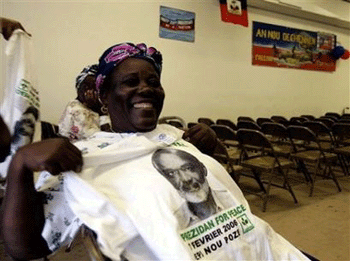 T-shirt which reads 'Rene Preval Prezidan for Peace' as Haitians in
