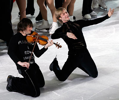 Yevgeny Plushenko of Russia poses beside violin player Edvin Marton after the Figure Skating gala of the Torino 2006 Winter Olympic Games in Turin, Italy February 24, 2006. [Reuters]