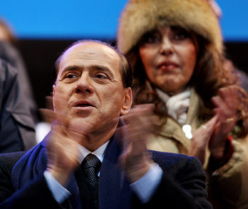 Italian Prime Minister Silvio Berlusconi applauds as his wife Veronica Lario