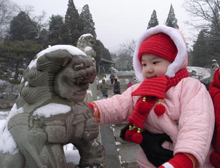 A Chinese girl touches a stone lionet covered with 'auspicious snow' in Beijing February 28, 2006. The snow adds much charm to the city. [Xinhua]