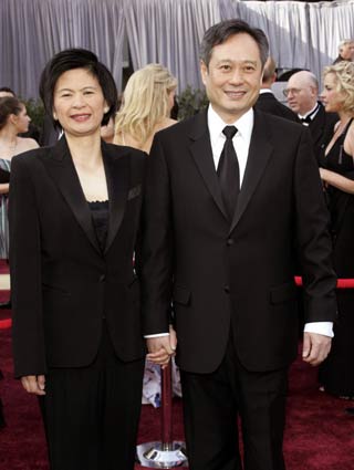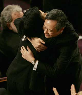 Director Ang Lee (R) hugs his wife Jane Lin