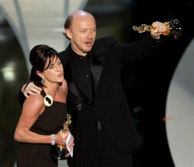 Haggis and Cathy Schulman accept the Oscar after the film 'Crash' won best