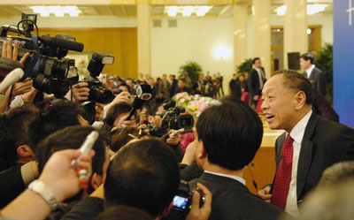 FM Li Zhaoxing (R) is surrounded and questioned by reporters after the press conference in the Great Hall of the People March 7, 2006. [Xinhua]