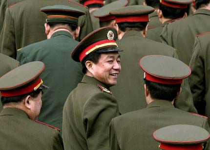 Chinese military delegates arrive at the Great Hall of the People before the National People's Congress session in Beijing March 9, 2006. [Reuters]