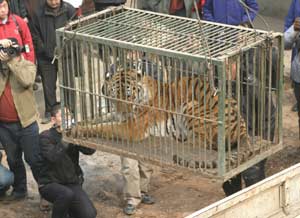 A tiger from Xi'an Zoo is on move to the newly-built wildlife park in a village of Shaanxi Province.