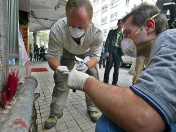 Two experts from the World Health Organization collect specimens a wildlife restaurant in Guangzhou, South China's Guangdong Province January 10, 2003 in a bid to trace the origin of the SARS virus. A waitress who worked at the restaurant is the second suspected SARS case this winter last week. [newsphoto]