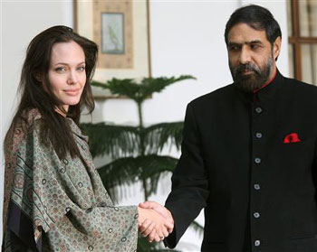 Hollywood actress and United Nations High Commission for Refugees (UNHCR) Goodwill Ambassador Angelina Jolie (L) shakes hands with India's Minister of State for External Affairs Anand Sharma before their meeting in New Delhi, November 5, 2006.