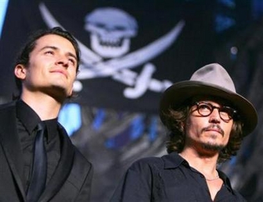Actors Johnny Depp (R) and Orlando Bloom pose at a premiere event for their film 'Pirates of the Caribbean: Dead Man's Chest' in Tokyo in this file photo from July 10, 2006. [Reuters]