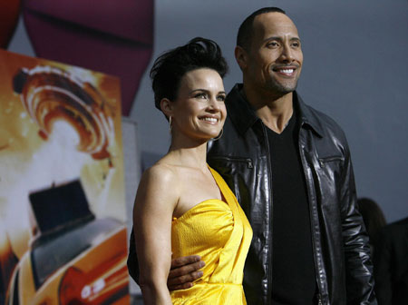 Cast members Carla Gugino and Dwayne Johnson pose at the premiere of the movie "Race to Witch Mountain" at El Capitan theatre in Hollywood, California March 11, 2009. The movie opens in the U.S. on March 13. [Agencies]