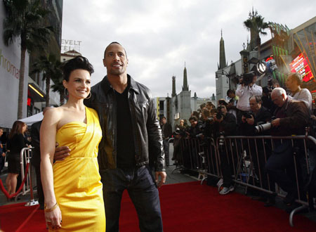 Cast members Carla Gugino and Dwayne Johnson pose at the premiere of the movie "Race to Witch Mountain" at El Capitan theatre in Hollywood, California March 11, 2009. The movie opens in the U.S. on March 13. [Agencies]
