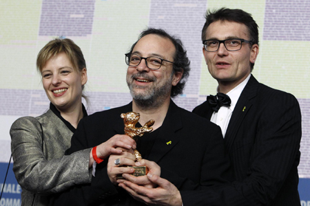 Producer Bettina Brokemper (L), Turkish director Semih Kaplanoglu (C) and producer Johannes Rexin pose with Golden Bear award for Best Film for his movie "Bal - Honey" during a news conference at the 60th Berlinale International Film Festival in Berlin February 20, 2010.[Agencies]
