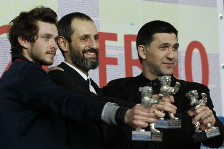 Cast member Grigory Dobrygin, Director Aleksei Popogrebsky and Sergei Puskepalis (L-R) pose with their Silver Bears for the movie "Kak Ya Provel Etim Letom" (How I Ended This Summer) at a news conference at the 60th Berlinale International Film Festival in Berlin February 20, 2010.[Agencies]