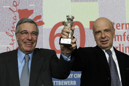 Producers Rob Benmussa (L) and Alain Sarde hold Roman Polanski's Silver Bear for Best Director for his film "The Ghost Writer" at a press conference at the 60th Berlinale International Film Festival in Berlin February 20, 2010.[Agencies]