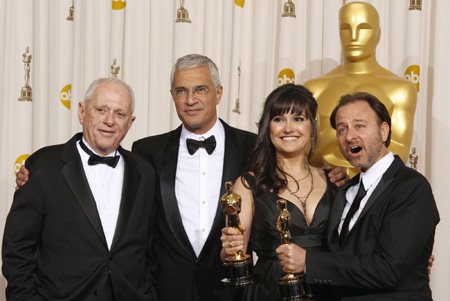 Best documentary feature winners Richard O'Barry (L), director Louie Psihoyos (2nd L), producer Paula DuPre Pesman (2nd R) and Fisher Stevens from the film "The Cove," display their Oscar at the the 82nd Academy Awards in Hollywood March 7, 2010.[Agencies]