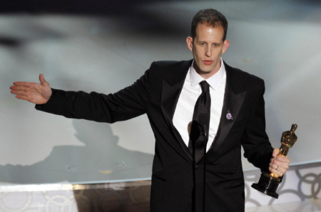 Pete Docter, director of "Up," accepts the Oscar for best aninmated feature film during the 82nd Academy Awards in Hollywood March 7, 2010.[Agencies]