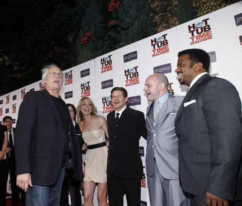 Cast member Chevy Chase (L) greets co-stars (from L-R) Collette Wolfe, Crispin Glover, Rob Corddry and Craig Robinson at the premiere of "Hot Tub Time Machine" in Hollywood, California March 17, 2010. [Agencies]