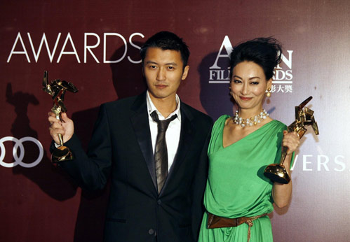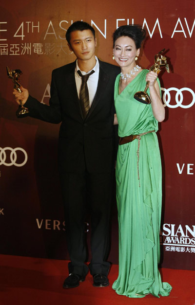 Hong Kong actor Nicholas Tse and actress Wai Ying-hung pose with their trophies after winning the Best Supporting Actor and the Best Supporting Actress awards at the Asian Film Awards in Hong Kong March 22, 2010.[Agencies]