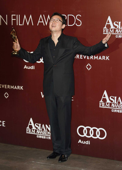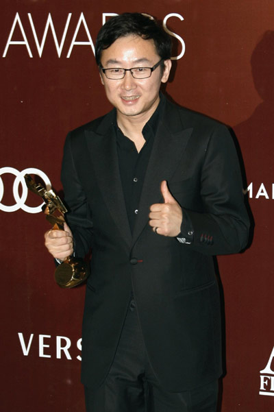 Chinese director Lu Chuan reacts with his trophy after winning the Best Director award for his movie "City of Life and Death" at the Asian Film Awards in Hong Kong March 22, 2010. [Agencies]