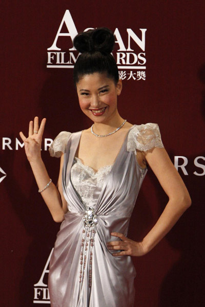 Chinese TV presenter Angela Chow poses upon her arrival at the Asian Film Awards in Hong Kong March 22, 2010.[Agencies]