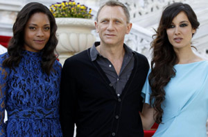 Berenice Marlohe (R), Daniel Craig (C) and Naomie Harris pose for the media during a photocall for the James Bond film "SkyFall" in front of the Ciragan Palace in Istanbul April 29, 2012.