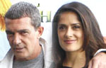 Antonio Banderas and Salma Hayek pose during a photocall to promote their animated film "Puss In Boots" in Warsaw Sept 27, 2011.