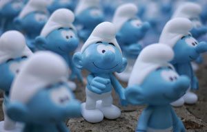 Smurfs figurines are displayed on a fountain during a photocall for the film "The Smurfs" in Cancun.