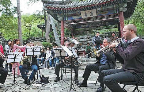 On a Monday afternoon at Fragrant Hills (Xiangshan), tourists unexpectedly met a brass quintet playing Bach and Brahms.