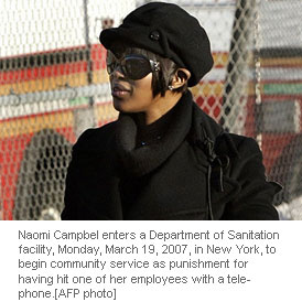 Naomi Campbell, wearing black stilettos and slinging dark work boots over her shoulder, traded the catwalk for community service Monday at a sanitation garage to start a five-day sentence for assaulting her maid.