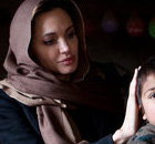 Angelina Jolie, meets with Khanum Gul, 35, a mother of 8 and her youngest son, Samir at their makeshift home at Tamil Mill Bus site February 2011, in Kabul city, Afghanistan.
