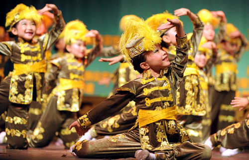 Child contestants perform during the "Stars Shine Over Tianshan Mountain" talent show in Urumqi, in northwest China's Xinjiang Xinjiang Uygur Autonomous Region, August 13, 2009. [Xinhua]