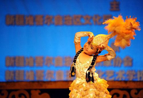 A child contestant performs during the "Stars Shine Over Tianshan Mountain" talent show in Urumqi, in northwest China's Xinjiang Xinjiang Uygur Autonomous Region, August 13, 2009. [Xinhua]